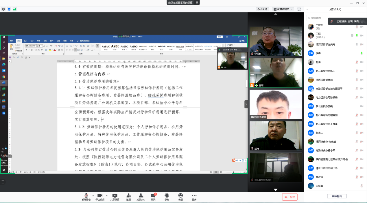 近日,安全監(jiān)察部通過網(wǎng)絡(luò)視頻形式召開了公司安全管理制度宣貫會議,對各項目部、電力試驗研究中心相關(guān)管理人員進(jìn)行《勞動保護(hù)管理制度》《安全環(huán)保工作獎懲規(guī)定》及《集團(tuán)公司注冊安全工程師管理辦法》等安全制度宣貫,詳細(xì)解答了參會人員提出的問題,記錄大家提出的建議和意見以備后期修訂完善。