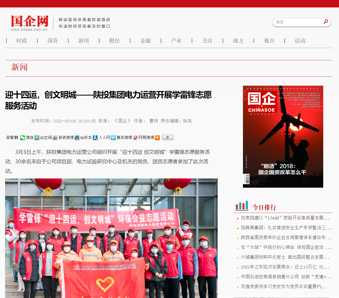 3月3日上午,陜投集團(tuán)電力運(yùn)營公司組織開展“迎十四運(yùn) 創(chuàng)文明城”學(xué)雷鋒志愿服務(wù)活動(dòng),30余名來自于公司項(xiàng)目部、電力試驗(yàn)研究中心及機(jī)關(guān)的黨員、團(tuán)員志愿者參加了此次活動(dòng)。