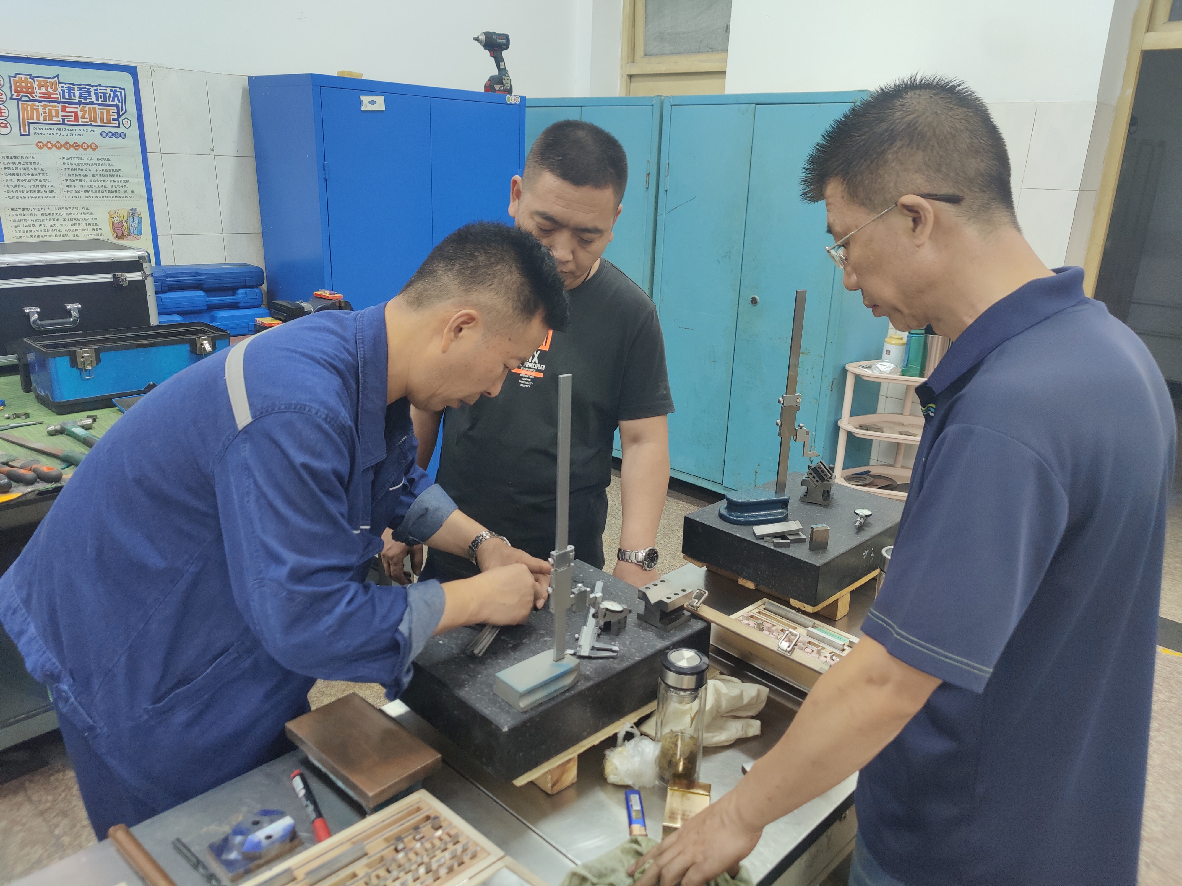 鉗工組選手主動(dòng)放棄期休息時(shí)間,加班加點(diǎn)進(jìn)行訓(xùn)練。指導(dǎo)老師針對(duì)不同工種,一對(duì)一、面對(duì)面,示范講解工件加工到0.005mm精度的操作方法,并逐一剖析參賽選手的不足,幫助選手掌握操作技巧。待晚上走出訓(xùn)練室時(shí),大家全身早已全部被汗水打濕,白色的工作服也被染成了鐵銹色。