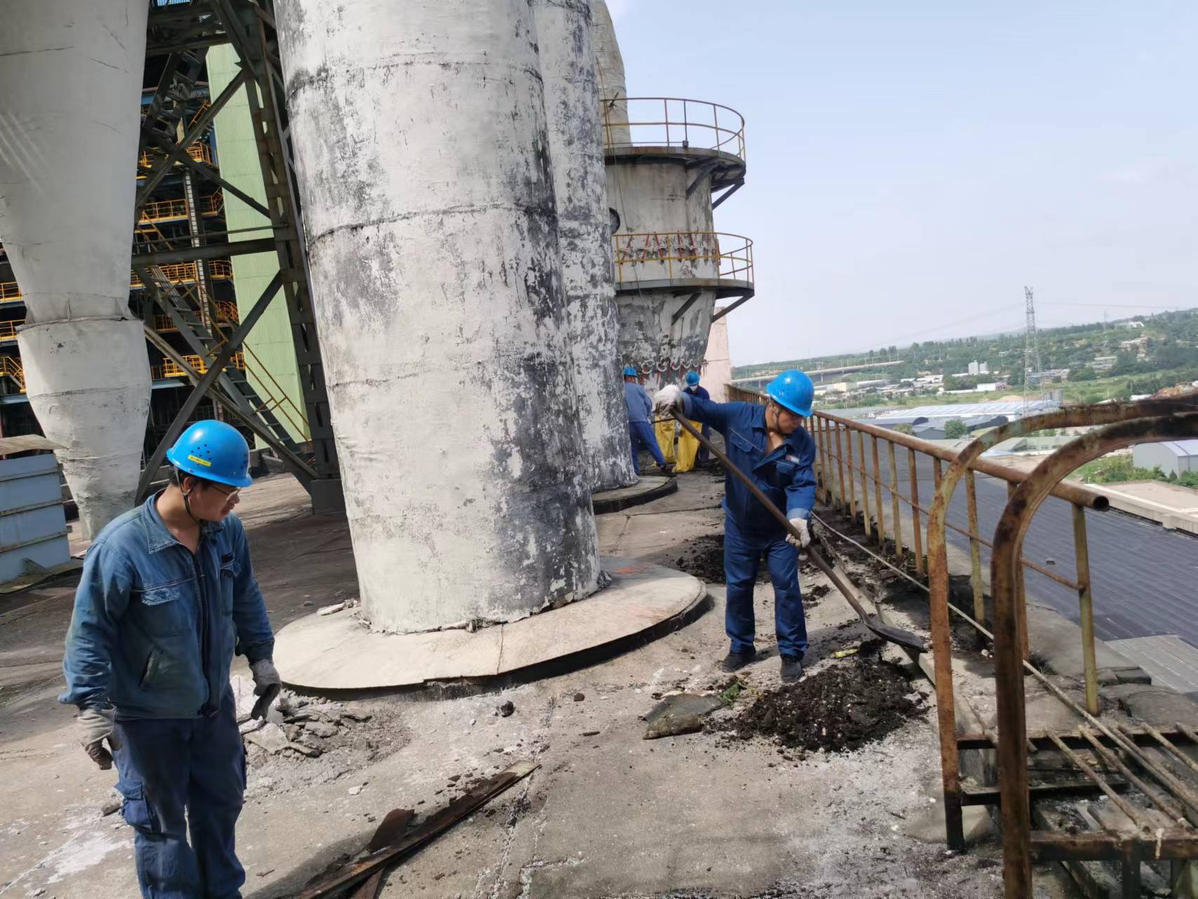 下午三點,驕陽似火,即便是不干活,在屋頂站一會就大汗淋漓,但24米除氧器平臺、循泵房頂、網(wǎng)控樓房頂…到處都是項目部員工忙碌的景象。烈日的炙烤加上高溫管道和煙道散發(fā)的熱量,環(huán)境溫度高達50多度,背上的衣服已經(jīng)浸出白色的鹽漬,臉上豆大的汗珠混著灰塵流淌,不一會功夫大家都成了“大花臉”。