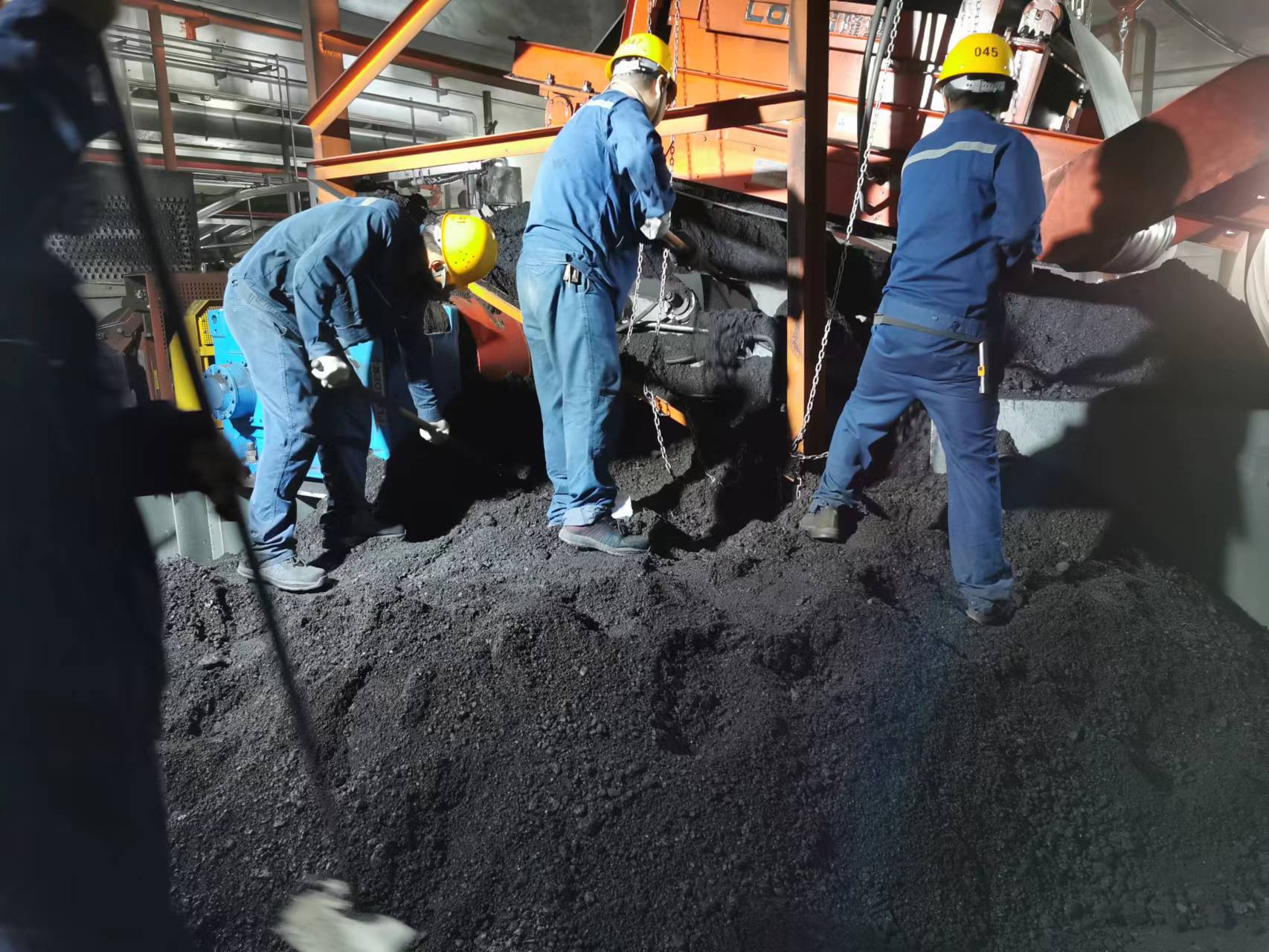 時(shí)間緊、任務(wù)急,在積煤最嚴(yán)重的#7帶拉緊小室,所有隊(duì)員面對(duì)堆積如小山的濕煤,齊心協(xié)力、配合默契,揮動(dòng)著鍬鎬,爭(zhēng)分奪秒裝運(yùn)積煤。有的積煤雖然沒(méi)那么濕,粘性卻很大,一鍬下去根本鏟不動(dòng),只能分割成“豆腐塊”逐一處理,最難對(duì)付的還是堆積在設(shè)備下部的積煤,大家直不起腰、發(fā)不上力,清理起來(lái)極為困難,只能用最原始的方式一鍬一鍬清理。30多度高溫使得運(yùn)行車(chē)間內(nèi)愈加悶熱,不一會(huì)兒人人大汗淋漓、手上磨起水泡,汗水浸透工衣,“煤山”也以肉眼可見(jiàn)的速度逐漸變小。經(jīng)過(guò)40小時(shí)的連續(xù)奮戰(zhàn),輸煤系統(tǒng)恢復(fù)正常運(yùn)行。