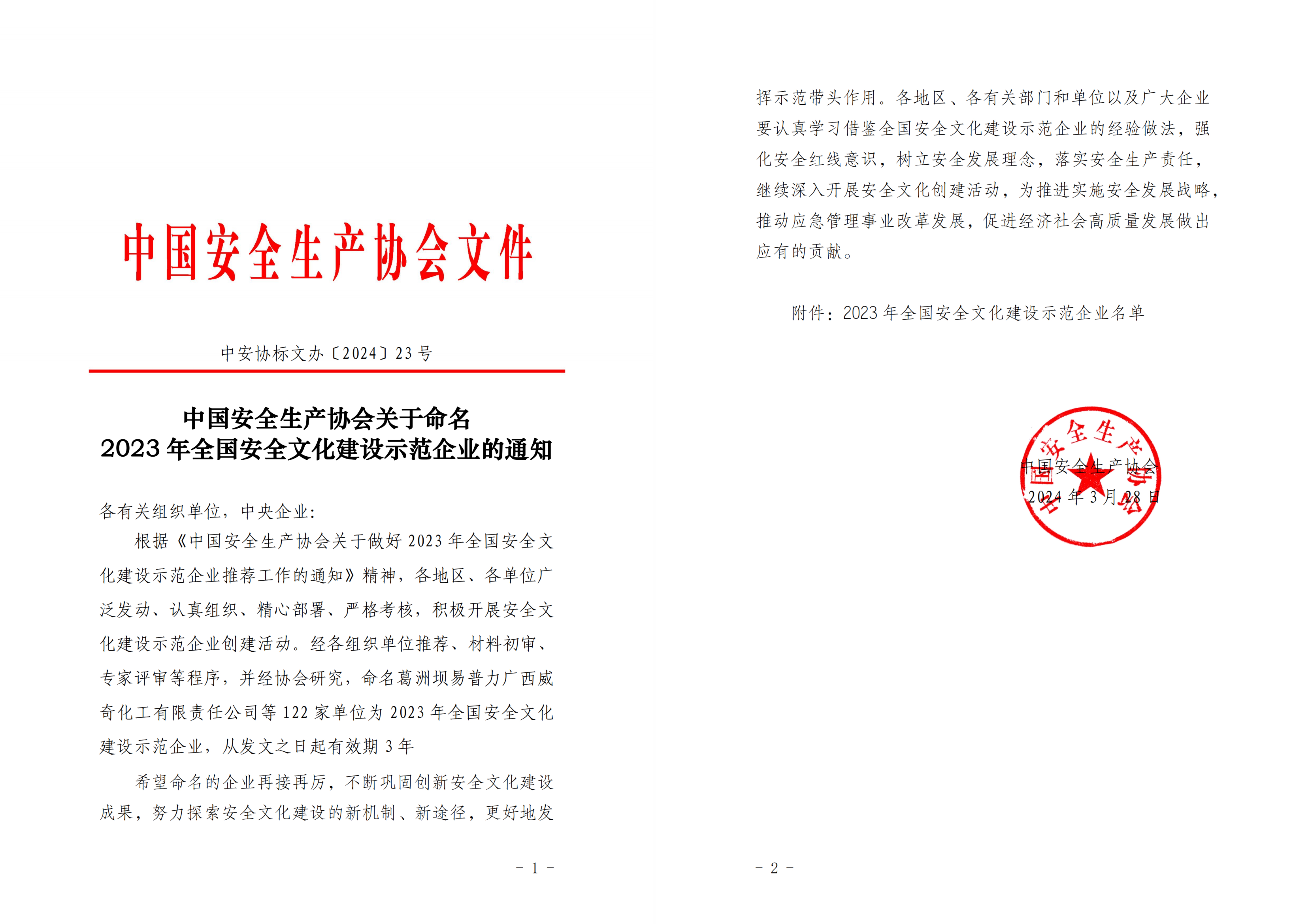3月28日,公司被中國安全生產(chǎn)協(xié)會命名為“2023年全國安全文化建設(shè)示范企業(yè)”。這是公司繼實現(xiàn)安全生產(chǎn)標(biāo)準(zhǔn)化一級達(dá)標(biāo)和取得“省級安全文化建設(shè)示范企業(yè)”稱號后,在安全管理方面取得的又一重要突破,標(biāo)志著公司培育“想安全、會安全、能安全”本質(zhì)安全型員工,建立安全文化長效機(jī)制取得重大進(jìn)展。