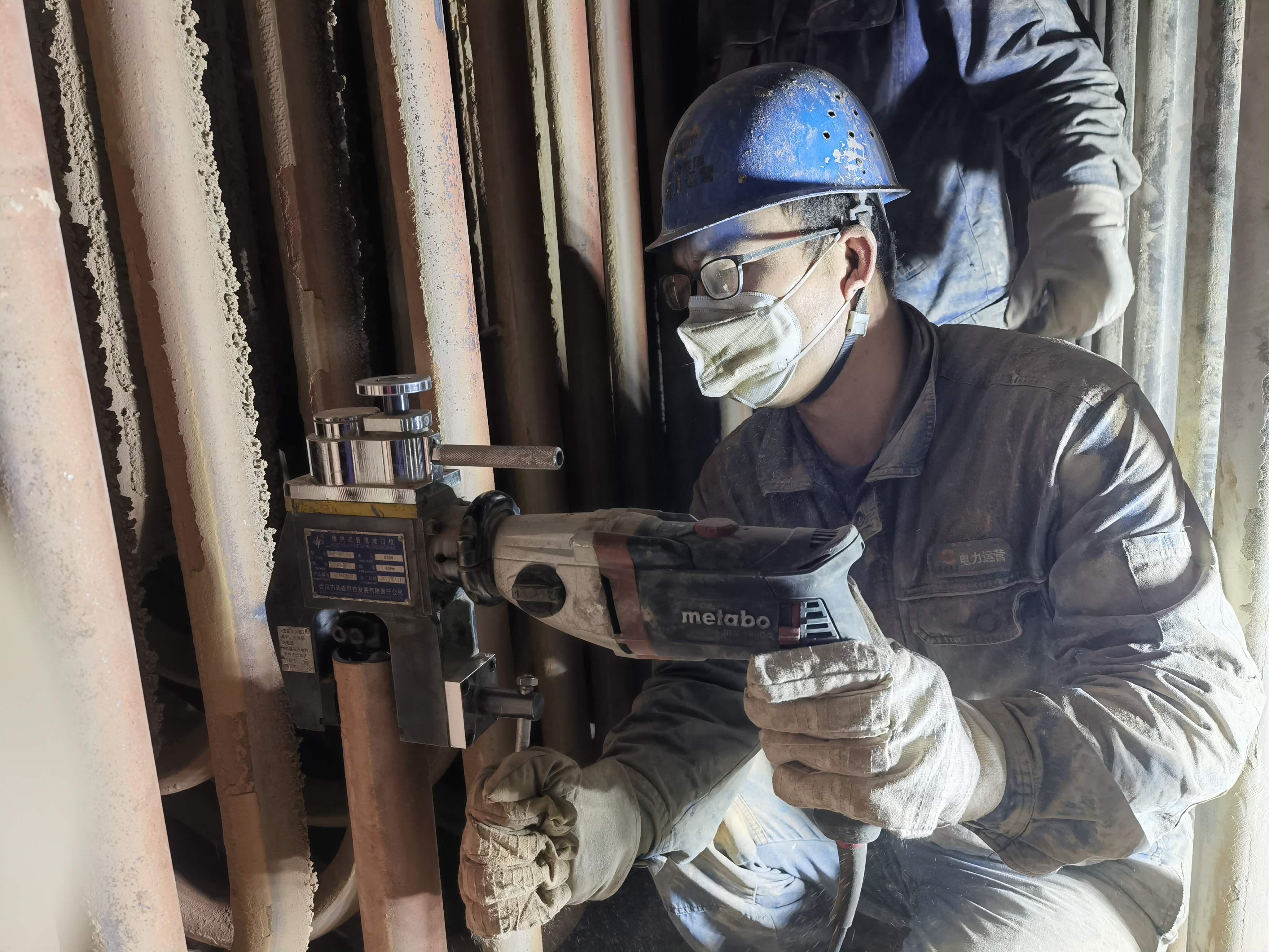 “此次檢修要檢查水冷壁四面和爐外主蒸汽測點(diǎn)割管,僅#5爐檢查焊補(bǔ)打磨點(diǎn)就有600多個(gè),堅(jiān)決要把好W、H點(diǎn)的驗(yàn)收關(guān),現(xiàn)場驗(yàn)收、現(xiàn)場簽字,做到一項(xiàng)都不能少,保證不掉鏈子。”談到質(zhì)量,正在進(jìn)行鍋爐大罩殼大管徑管道、三通焊縫磁粉檢測的鍋爐專業(yè)專工劉宏感觸頗深。