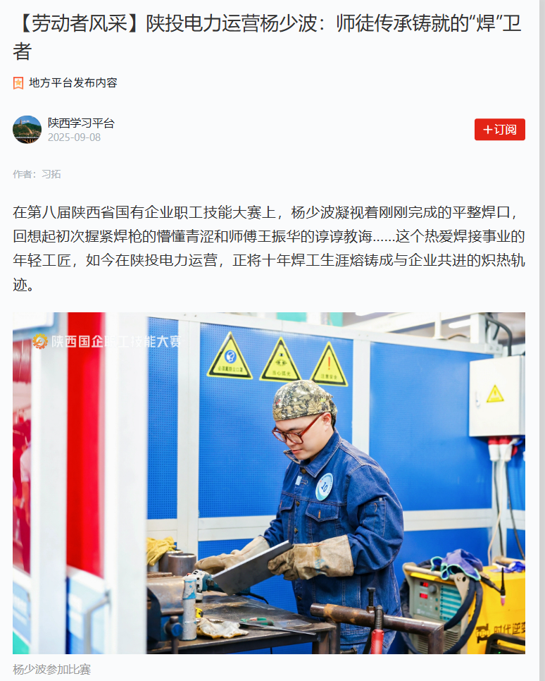 楊少波的成長遠不止于技藝。2025年5月,他獲得公司技能大賽第五名;7月,奪得第八屆陜西省國有企業(yè)職工技能大賽焊工賽項季軍。“這不是我一個人的成績,是公司給了我舞臺和資源?!比缃?,他的焊接合格率穩(wěn)居99%以上,更深刻體會到焊工不僅是連接鋼鐵,更是在焊接責任。
