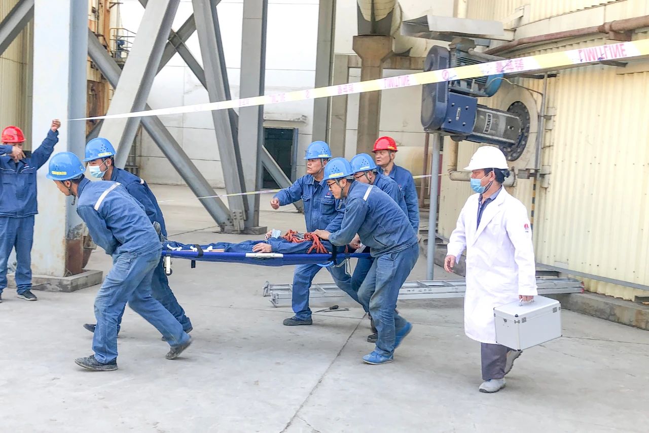 演練以工作人員在#3爐吸收塔閥門作業(yè)時(shí)發(fā)生事故為內(nèi)容展開。事故發(fā)生后,項(xiàng)目部立即啟動(dòng)應(yīng)急救援預(yù)案,對(duì)事故進(jìn)行急救處理,對(duì)現(xiàn)場(chǎng)進(jìn)行警戒隔離。應(yīng)急救援小組在專人的引導(dǎo)下迅速進(jìn)入現(xiàn)場(chǎng),對(duì)傷者進(jìn)行止血、腿部固定后,立即將其抬上救護(hù)車,緊急送往醫(yī)院。